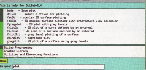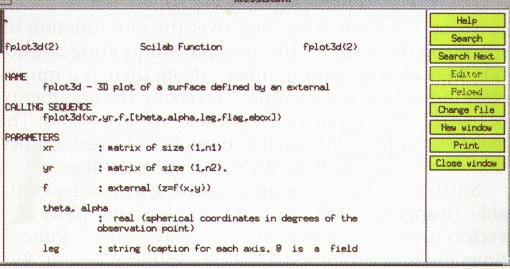 Help is available several different ways. Typing help at the scilab prompt, followed by a function name, will produce a window with the help text for that function. Or use the help button in the main window (shown in Figure 1) to create the Scilab Help Panel (shown in Figure 2). This method allows a search of the help files with the apropos command, shown here with a search for the keyword plot. There are 10 entries shown in the figure of the 28 available for plot. With a single click on fplot3d, an xless window pops open with detailed information on the use and the arguments of the function (shown in Figure 3).