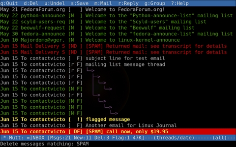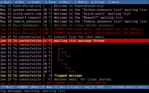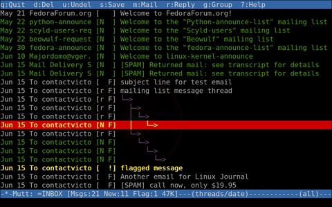 Now that you have access to your IMAP account and can send e-mail, here are some shortcuts for managing your Inbox. These shortcuts are the seductive draw of Mutt. You can zip through your e-mail quickly without ever touching a mouse.