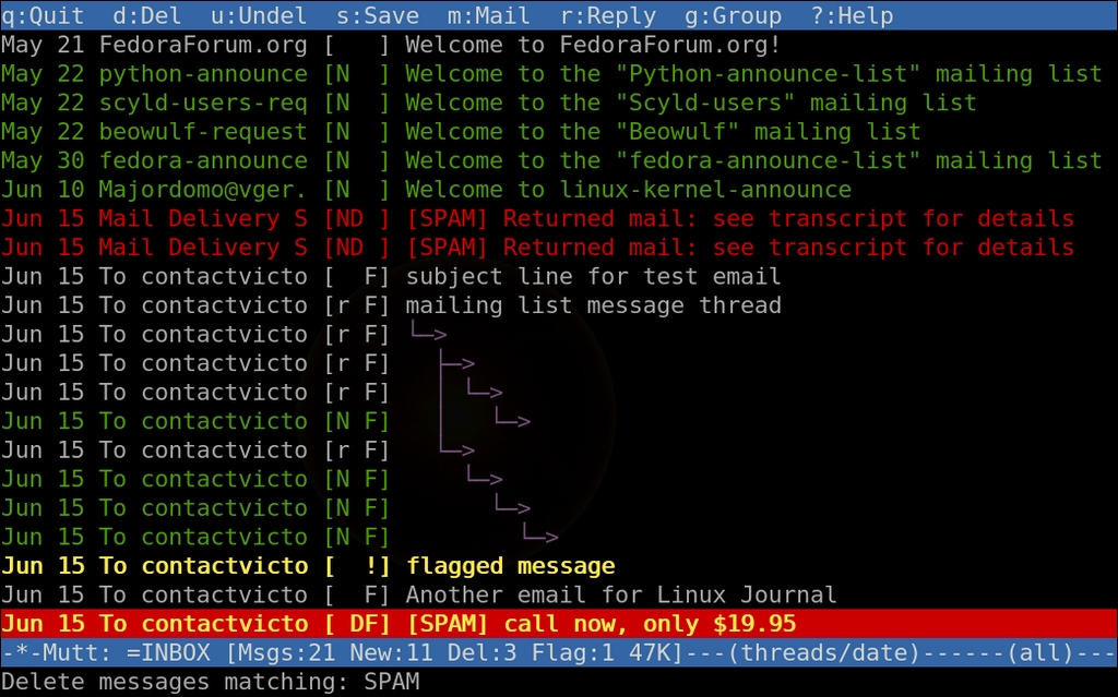 Color settings in Mutt are particularly useful in the index view. If you use the color settings from my example .muttrc, all new messages are displayed in green, flagged messages are displayed in yellow, deleted messages are red and tagged messages are purple (more on tagging later).