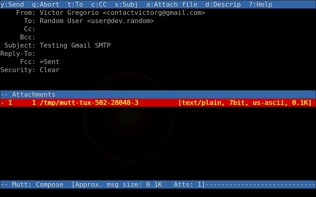 Now, let's send a test message using the Gmail SMTP server. Press M to compose an e-mail message. Fill in the To: line, then the Subject: line. Your e-mail editor opens automatically. Write your message, save and quit. You will see a page that allows you to edit the Cc, Bcc and other fields. Finally, press Y to send the message.