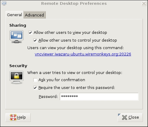 Our example remote system, remotebox, already is running sshd. Suppose it also has vino, which is also known as the GNOME Remote Desktop Preferences applet (on Ubuntu systems, it's located in the System menu's Preferences section). First, presumably from remotebox's local console, you need to open that applet and enable remote desktop sharing. Figure 2 shows vino's General settings.