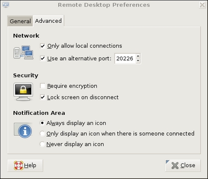 If you want to view only this system's remote desktop without controlling it, uncheck Allow other users to control your desktop. If you don't want to have to confirm remote connections explicitly (for example, because you want to connect to this system when it's unattended), you can uncheck the Ask you for confirmation box. Any time you leave yourself logged in to an unattended system, be sure to use a password-protected screensaver!
