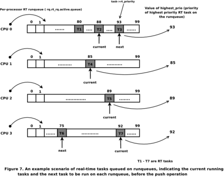 The real-time scheduler of the -rt patchset adopts an active push-pull strategy developed by Steven Rostedt and Gregory Haskins for balancing tasks across CPUs. The scheduler has to address several scenarios: