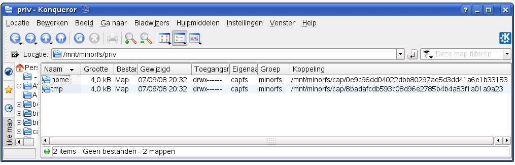 When a process is started and accesses the /mnt/minorfs/priv/home symbolic link, this symbolic link will point to the same MinorCapFs subgraph as the previous time the program was invoked into the same slot.