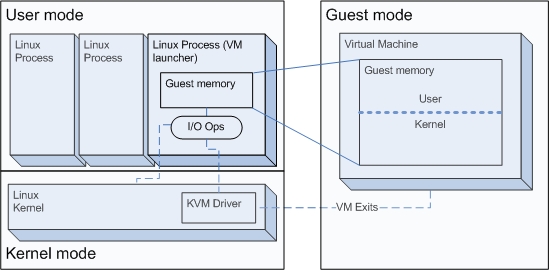 A normal Linux process has two modes of execution: kernel mode and user mode. KVM adds a third one: guest mode (Figure 1). When a guest process is executing non-I/O guest code, it will run in guest mode or perhaps better-named guest-user mode. This is the “user” mode shown inside the “Guest mode” box in Figure 1. In kernel mode (guest-kernel), the process handles exits from guest-user mode due to I/O or other special instructions. This is the “kernel” mode shown inside the “Guest mode” box in Figure 1. In user mode, the process performs I/O on behalf of the guest. This is the “I/O Ops” box shown within the normal “User mode” box in Figure 1. For more on how KVM itself operates, see the KVM Web site and the many on-line articles about it.
