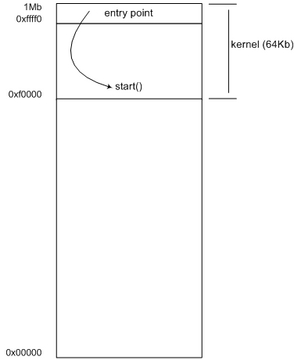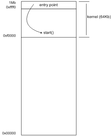 Listing 3 contains the code for the launcher, including the load_file() function to copy the guest kernel image from a file to the virtual machine's memory space. Why is this image copied at offset 0xf0000 of the guest's memory space? Because of the way real-mode works, as explained in the next section.
