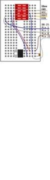 After the sockets are soldered, remove the module and solder four wires to VCC, DOUT, DIN and GND. After that, solder four more wires to the male DB-25 connector on pins 1, 2, 8 and 21. The pins should be labeled, although the markings are faint. Next, break off two six-pin lengths from the strip of male header pins, and solder them to each side of the level converter. Again, it is easiest if you use the breadboard as a jig to hold the pins straight as you solder them. Finally, assemble everything according to the schematic (Figure 2) and/or the breadboard wiring diagram (Figure 3). The completed breadboard is shown in Figures 4 and 5.
