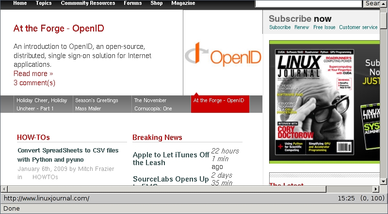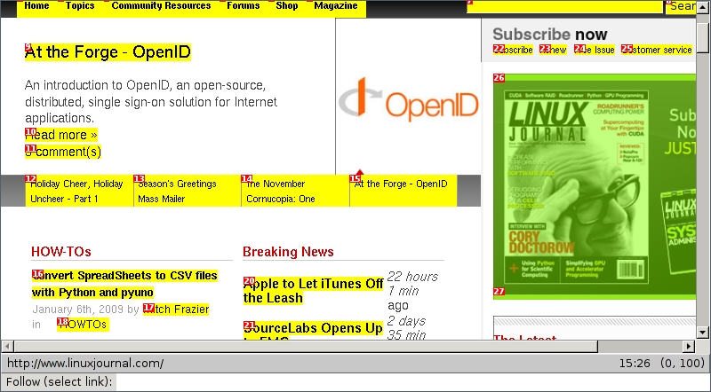 Although you can follow links by clicking them, you should learn to follow them using the keyboard to get the most out of Conkeror. To follow a link with the keyboard, press f. Conkeror places a small number next to each link (Figure 2), including link images. Enter a number to follow its link or type letters from the name of the link you want. As you type letters, Conkeror removes the numbers from links that don't match those letters and renumbers the remaining links. Even on a slow computer, this happens instantly. If only one link matches the letters you entered, Conkeror automatically follows it.