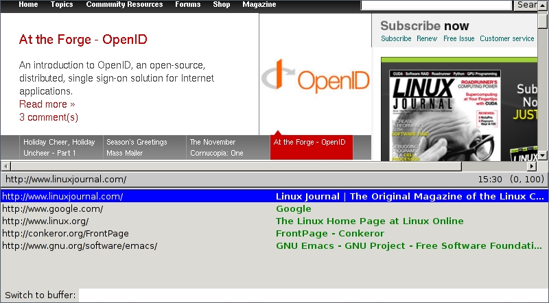 Return to the previous buffer by pressing M-p (Alt-p on PCs and Option-p on Macs); advance to the next buffer by pressing M-n. Press C-x b to display a list of open buffers (Figure 3). Each buffer in the list has a name—its URL plus its title. Select a buffer name from the list using the keyboard arrow keys or narrow the list by typing part of a buffer's name. Press Enter at any time to show the selected buffer.