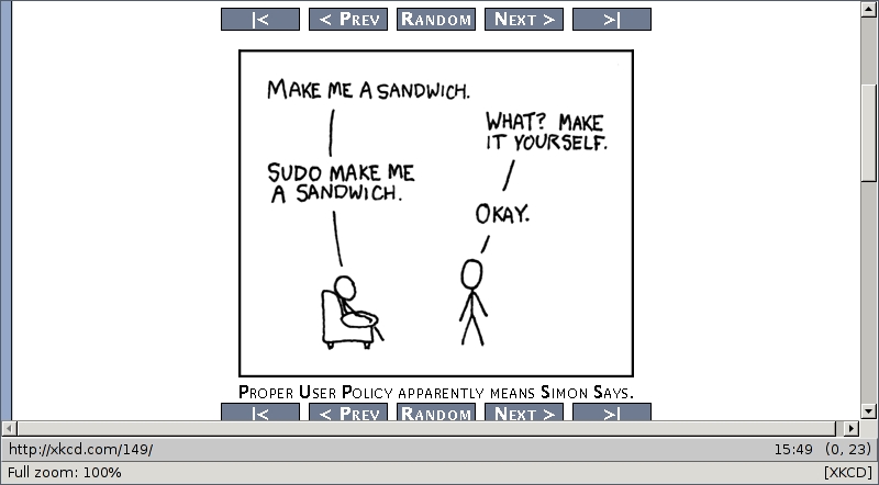 Conkeror includes special scripts, called modes, that change its behavior on specific sites—for example, the simple XKCD mode for the xkcd.com comic-strip site. When you visit xkcd.com in Firefox, it displays the comic's title when you move your mouse over the image. When you visit xkcd.com in Conkeror, it activates XKCD mode (Figure 4) and displays the title below the image in a special font—you don't need to move your mouse over the image.