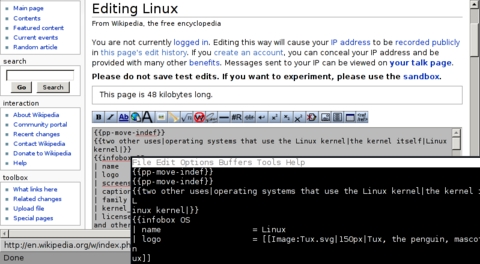 Conkeror lets you edit HTML text boxes in an external text editor—for example, Emacs (Figure 5). Conkeror copies the text box's contents to a temporary file, opens your text editor on the file and reads the changed file back into the text box when you close your editor. To use this feature, you must compile Conkeror's small helper program, conkeror-spawn-helper. (If you used the instructions above to install the two Conkeror packages in Debian or Ubuntu, you may skip this paragraph.) Go to the Conkeror source directory you installed and run the following command: make. You don't need to run make install, because make compiles the program in the directory Conkeror uses.