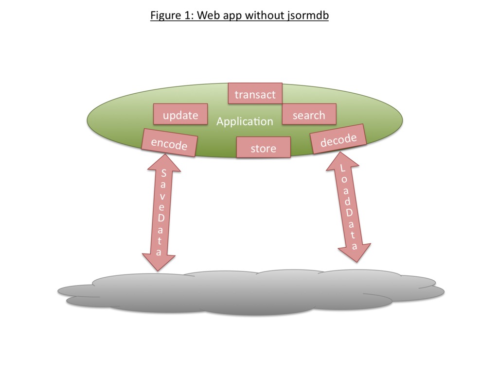 jsormdb provides a solution to all of these problems. When configured correctly, the presentation and business logic within your application can treat jsormdb as the entire data store, leaving jsormdb to handle persistence to/from the server. Without jsormdb, your application looks like Figure 1.