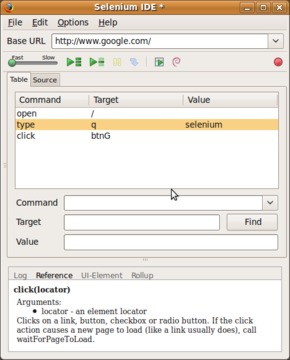 After installation, the IDE is accessible via Tools→Selenium IDE in the Firefox menu. To illustrate the IDE functionality, let's re-create the above Google search test case using the IDE. In order to do this, you simply should run the IDE, check that the record button is on, open the https://www.google.com page, type selenium and click Google Search. As you type, the Selenium IDE captures what you do (Figure 3).