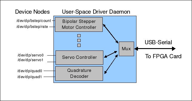 Doing 25 drivers in the kernel, although possible, would have required time and effort far beyond what the company could afford. The process of building kernel device drivers would have been even more complicated because the FPGA card connects to the Linux host over a USB-serial link. The solution, illustrated in Figure 1, is to have a dæmon manage the USB-serial port and demultiplex the various FPGA-based peripherals out to their own device nodes. The device nodes are little more than shims that let the high-level application deal with separate device entries for each peripheral.