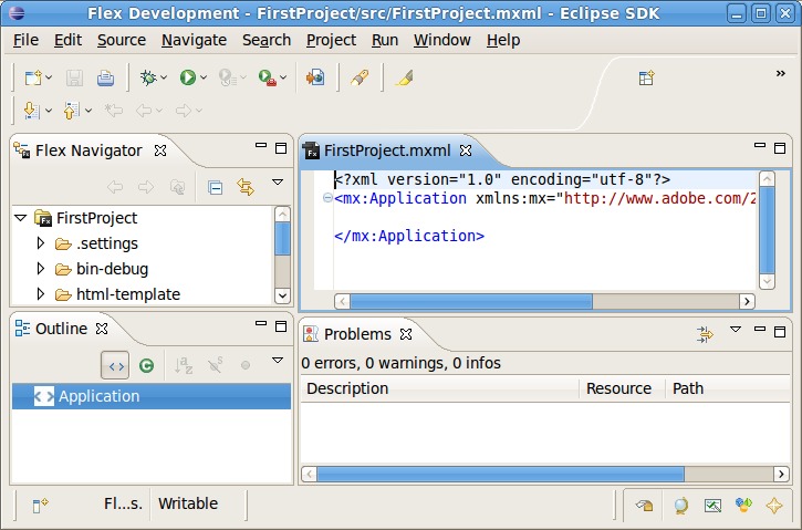 Because this was my first experience with Eclipse, I took time to review the Eclipse tutorials before closing the Welcome screen. To switch from the default Java development environment to Flex, click Windows→Open Perspective→Other, and select Flex Development. Now, create a Flex project by clicking File→New→Flex Project. I chose to create a browser-based SWF file and named it “FirstProject”.