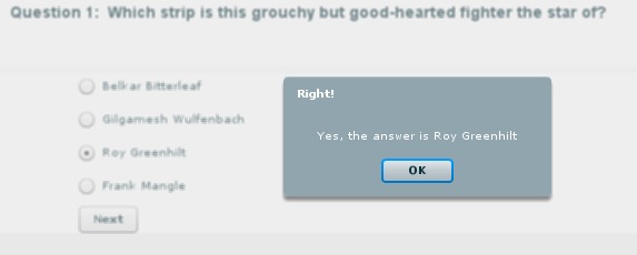 For this first simple application, I decided to create a simple Internet quiz that asks the user some questions, then supplies a “Webcomics IQ” score (I'm a big fan of Webcomics). This let me avoid having to worry about server database access on my first project. For this project, I need to use MXML to draw a simple form, which contains a question (text field) and four possible answers (radio buttons), along with a Next button. When the user clicks Next, the next question is displayed in the text field. After the last question, the score is displayed.