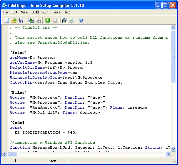 Inno Setup is a free and open-source installer for Windows programs. It's been around since 1997 and is written in Delphi Pascal. Inno Setup is driven by a script that you provide, allowing Inno Setup to create an installer for your program. The script is much like an INI file. You provide simple name/value pairs that drive the creation of the installer. For more complex scenarios, Inno Setup contains its own built-in Pascal compiler for creating real “code” sections in the script.