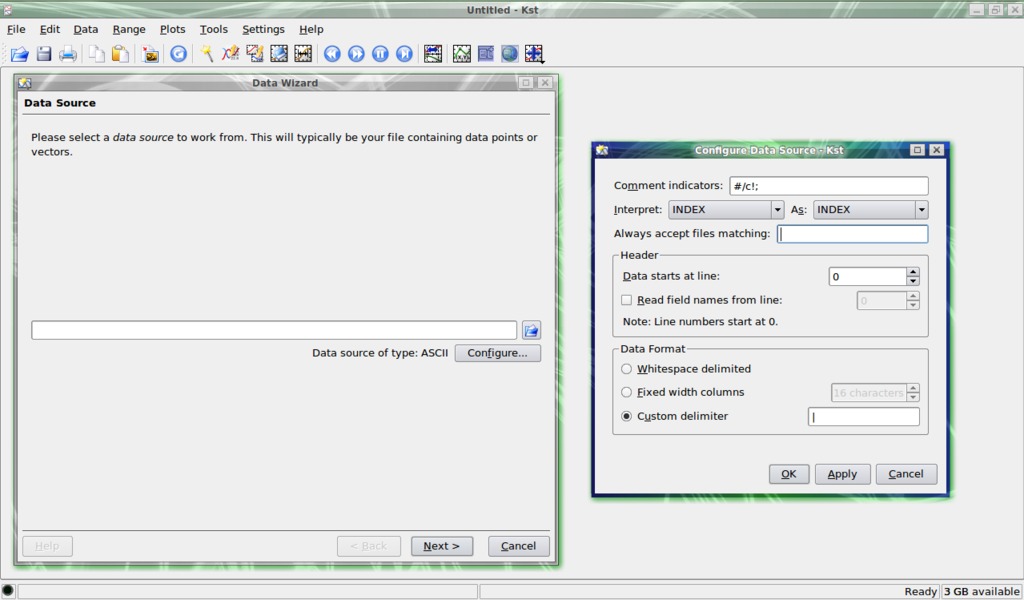 Click on the Data Wizard button at the bottom of the Kst QuickStart pop-up pane. Figure 1 shows the kst toolbar, data source and configure data source windows. The pop-up Data Source pane will appear. Enter the data filename, testdata.txt. Press the Configure button. The Configure Data Source pane appears. Enter the custom delimiter character to separate the values in the data set. I used the vertical bar as a delimiter between the temperature and light-level values.