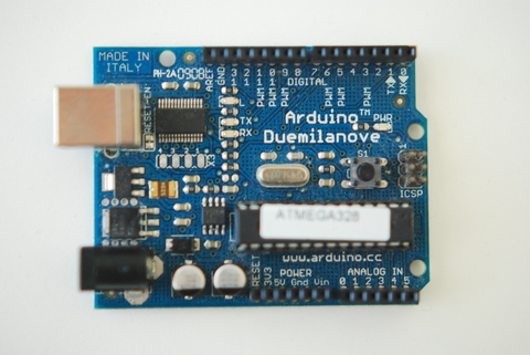 The flagship Arduino module is known as the Duemilanove. It is a 2.7" x 2.1" circuit board that has 14 digital I/O (input/output) pins and 6 analog input pins. It also has a built-in USB port, uses an Atmel Atmega 328 processor and screams along at 16MHz. Modules are powered by batteries or from a wall wart, with a recommended range of 7–12 volts DC.