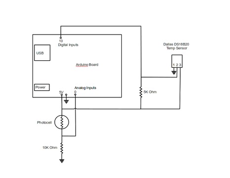Figure 4. The Circuit Required to Read the Photocell and Hook Up the Dallas DS18B20 One-Wire Temperature Sensor
