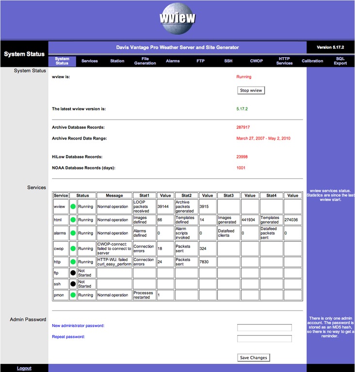 To configure wview, open your favorite browser and point it to the wview management Web site, typically https://[your_wview_server]/wviewmgmt/login.php. An HTTP server is required on the wview host (this will be installed automatically if you use the APT packages). Use the default administration password “wview” (you can change this later). After logging in successfully, the System Status page is displayed (Figure 2). The System Status page displays the current state of all wview services as well as other status information.