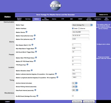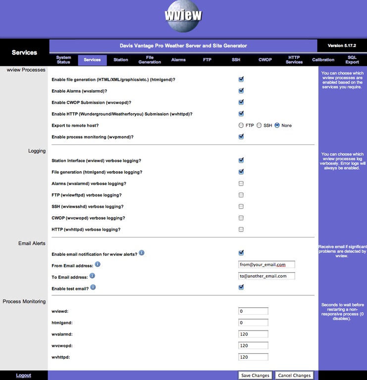 This page provides the configuration of wview services, log verbosity for the services and e-mail alerts. Services available are File Generation, Alarms, CWOP, HTTP (Weather Underground and Weatherforyou), File Export (SSH or FTP) and Process Monitoring. For now, let's not enable any additional services until you have confirmed your station interface.