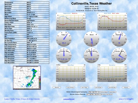 Current conditions are given in the table on the left and by the dials in the center and on the right. These values are updated every time station data is polled (default is 30 seconds). The weather site pages are regenerated every 60 seconds (configurable). Observing changes in the current conditions is an easy way to confirm proper station interface operation.
