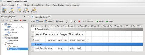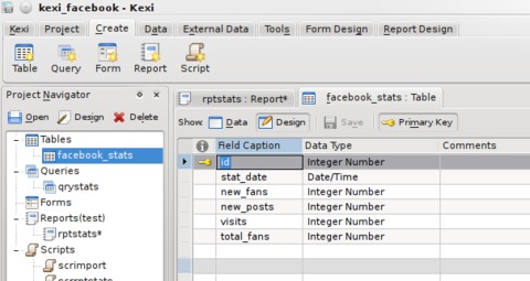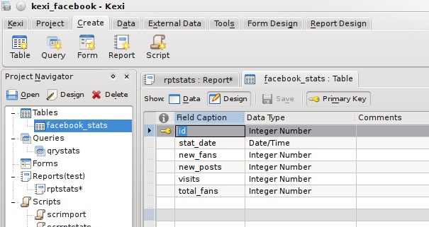 The database requires a name (I chose kexi_facebook), followed by a location to save it. The default location is fine. After this, you are presented with the main Kexi window. The main window contains a toolbar along the top and a project navigator down the left-hand side. The main toolbar in Kexi is different from the other KOffice applications and uses a tab-style layout. Each opened window also has a local toolbar for options specific to that window, such as table, query, form, report and script.