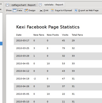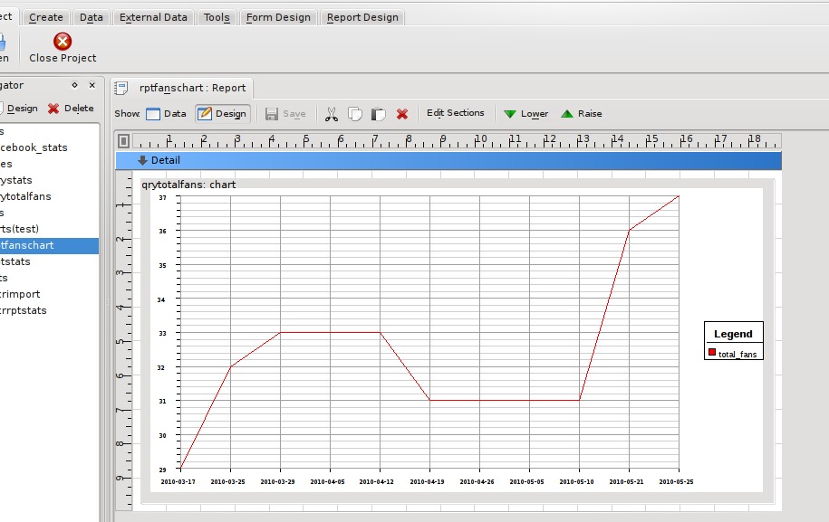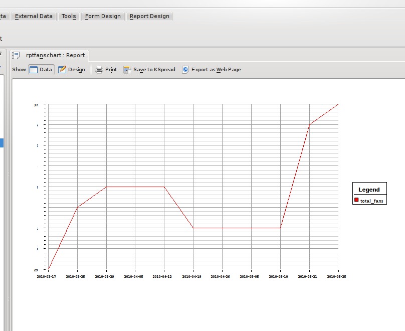 My final requirement at this stage was to have something more graphical: a nice chart to show the trend of fans over time. The report designer allows the creation of charts using the KDChart library from KDAB and is used in the KOffice program KChart. It is quite powerful, allowing you to join chart data to the main report data (called master-child links), but for now, all I needed was a simple, single chart. The chart object expects data in a certain format. There must be two or more columns of data. The first column is used for the labels on the X axis, and all other columns are used as a series in the chart. I started by creating a query with two columns, date in ascending order and total fans, then created a new report. The report itself is not based on any data, so its Data Source was left empty. An empty data source will produce a report with one detail section, providing an area to add a minimal set of items to a report.