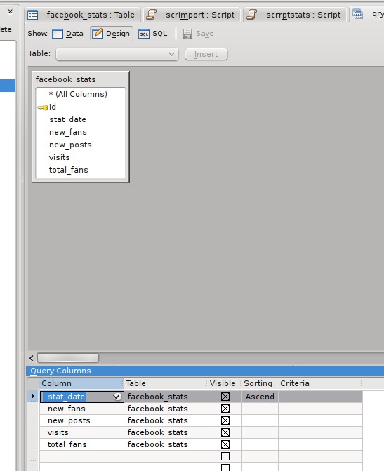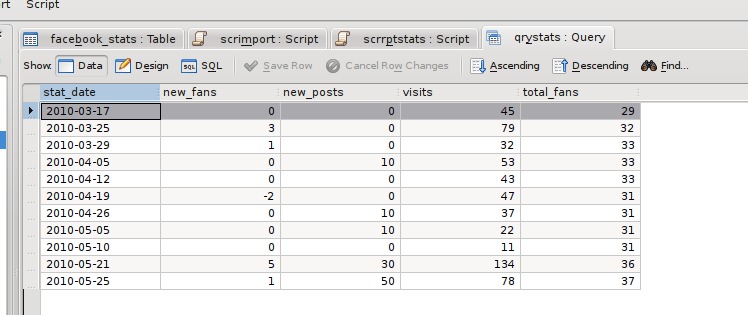 The statistics I receive via e-mail include the date, number of new fans, number of wall posts, number of visits and total fans, so I created a table with the design schema shown in Figure 1.
