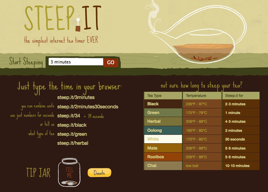 For example, I love the STEEP.IT Web site. Like the old tea-timer applications we have used in the past, this simple Web-based application helps me get perfect green tea instead of over-steeped yuckiness. Just visit steep.it/green, and the counter starts for a perfect cup of green tea.