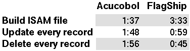 It's reasonable to expect that Acucobol would be noticeably slower than Flagship, since Flagship programs are compiled into machine code, and Acucobol programs are compiled into b-codes, which must be interpreted at run time.