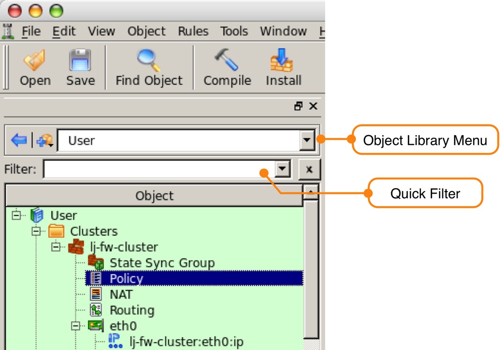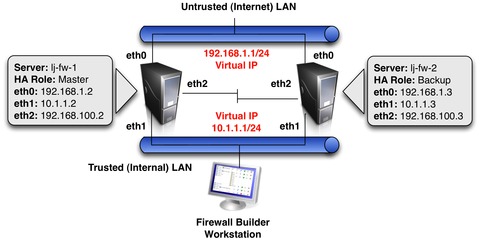 The focus of this article is using Firewall Builder's cluster feature to manage a single firewall policy for the HA firewall pair, but let's start with a quick overview of a few key Firewall Builder concepts.