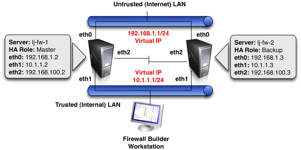 The collection of open-source packages that I use to create the HA firewall in this article are iptables, conntrackd, keepalived and Firewall Builder. The network diagram in Figure 1 shows the example environment that will be configured.
