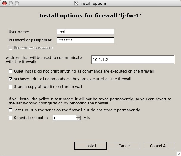 As previously mentioned, the process where Firewall Builder converts the rules into a firewall script that will be run on the firewall is called compiling the rules. To compile and use the built-in installer to deploy the rules, click on the Install button at the top of Firewall Builder to launch the install wizard.