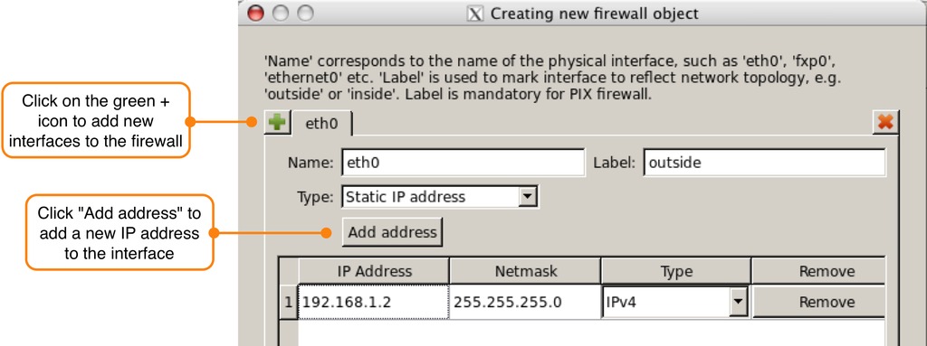 Figure 2 shows an example of the interface dialog window after the first interface, eth0, has been defined. Once all interfaces are configured, click the Finish button to create the firewall object.