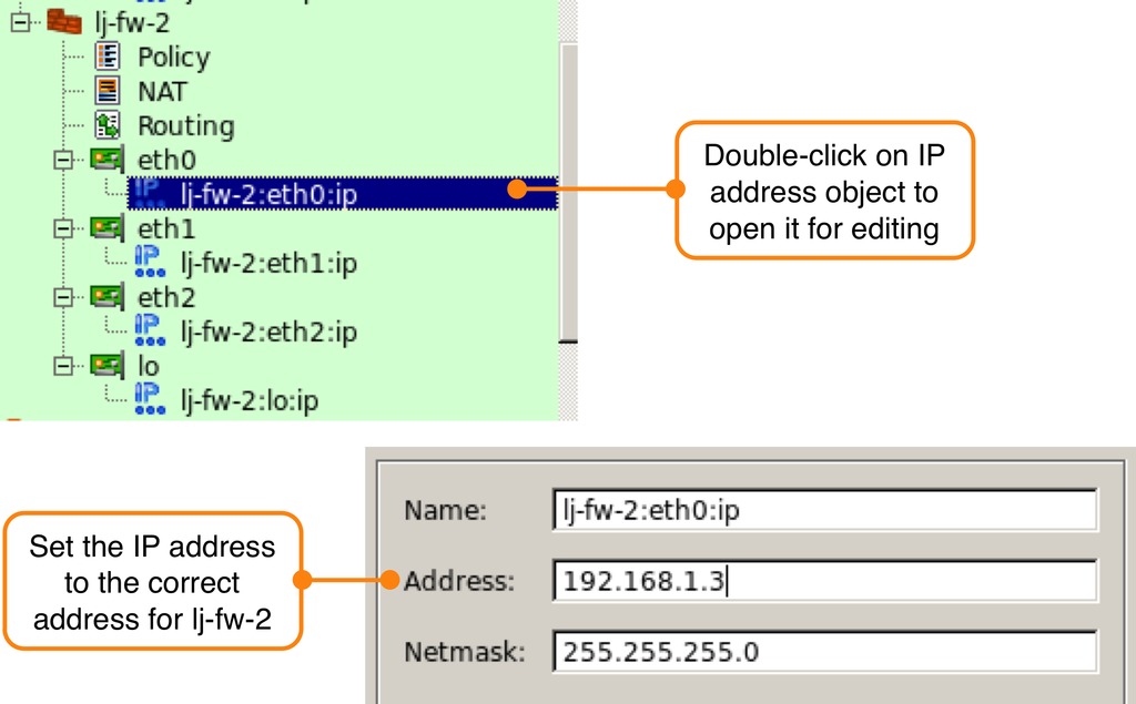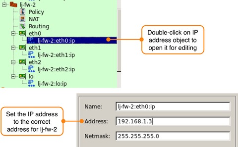 When the firewall is duplicated, the interface IP addresses on the new firewall are the same as the interface IP addresses on the original firewall. Update the interface IP addresses to match the correct IP addresses for the eth0 interface on the lj-fw-2 firewall as shown in Figure 3. Repeat this process for IP addresses of interfaces eth1 and eth2.