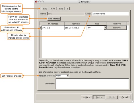The third dialog window (Figure 4) is where the failover protocol and virtual IP addresses are defined. For each interface tab at the top of the dialog window, enter the values according to the information in Table 1.