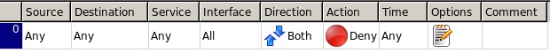 Drag and drop the interface object named “lo” from the lj-fw-cluster in the object tree to the Interface field of the rule on the right. Right-click in the Action field of the rule and select Accept. Finally, right-click in the Options field of the rule and select Logging Off. After this is done, the rule should look like Figure 5.