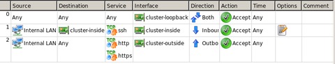 Note that the lo interface object used in the rule was from the cluster object, not an individual firewall's loopback interface object. When Firewall Builder generates the firewall configuration script for each individual firewall, it automatically replaces the cluster interface object with the local interface values for that firewall.