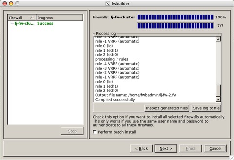 Click the check box next to the cluster name, and make sure the Install check boxes are selected for both lj-fw-1 and lj-fw-2. If there are any errors in the configuration, the compiler will display these; otherwise, you will see a dialog window (Figure 9) showing that the cluster was compiled successfully. When the cluster is compiled, a firewall for each member of the cluster is created and saved locally on the machine where Firewall Builder is running.