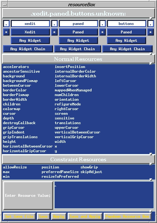 Resources, and the widgets they modify, have a hierarchical nature. “What's a widget?” you ask. Widgets are the basic building blocks, or objects, of X programs. Some example widgets with which everyone is familiar: scrollbars, text-entry fields, buttons, and checkboxes. In the above resource, the Label widget is a “child” of the Paned widget, which is a “child” of Xedit. This will become more clear when the editres program is introduced below.
