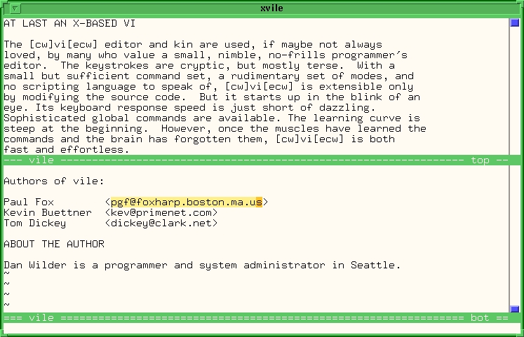 An example xvile window is shown in Figure 1. The shaded text in the lower window is a mouse selection, to which any of those cursor-movement “operator” commands can be applied using ^s (which I've rebound to g). So in traditional vi, to delete a word starting at the cursor, you would type: