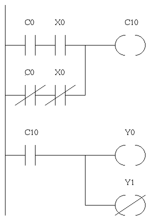 Ladder logic is a rule-based language; an example is given in Figure 1. The line on the left side of the diagram shows a “power rail” with the “ground” for this rail on the right hand side (not shown). The rules for the language are coded by completing “circuits” in ladder rungs from left to right. In the diagrams, “||” corresponds to switch contacts, and “()” corresponds to relay coils. Slanted bars through the contacts and coils denote the complement. The “X” switch contacts are mapped to real binary input points, the “Y” relay coil contacts are mapped to output points, and the “C” contacts/coils are software points used for intermediate operations. In the example, closing X0 and C0 or opening X0 and C0 will energize the C10 coil thereby closing the C10 contact. The C10 contact activates Y0 and turns off Y1.