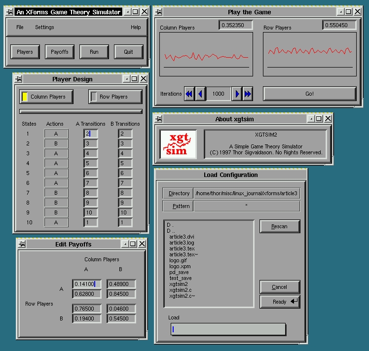 Last month, we followed this procedure to get our basic game theory simulator up and running. While that gave us the basic windows we needed to be able to control and observe the underlying simulation, there were a number of shortcomings. We had no way to save the settings of any particular run of a game, no pull-down menus and no pixmaps to make our program look somewhat professional. The new version of the simulator (called xgtsim2) adds all of these elements and includes a few other bells and whistles that we discuss throughout this article.