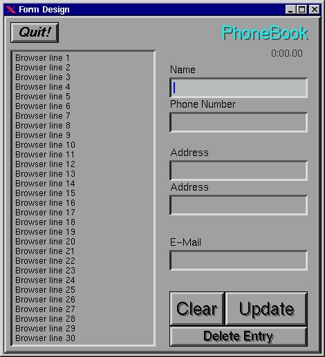 fl_show_form($list,FL_PLACE_FREE,FL_FULLBORDER, "Phone Book");There are also commands to make the form disappear, so it's fairly easy to handle multiple forms. The options you feed fl_show_form include the specific form you wish to display (remember we called ours “list”), options for the window manager and a title. Once everything is set up and you're ready for the user to interact with the GUI, you then keep calling the function fl_do_forms. Thus, the minimal amount of code you need to display this form is: