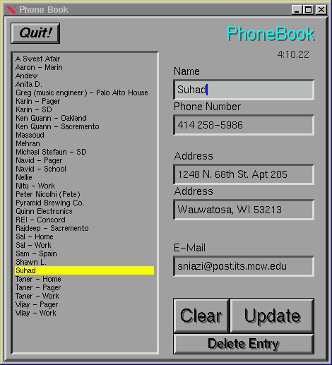 Another thing to note is that rather than having a “save” button, this phone book assumes you wouldn't make a mistake. Thus, it saves the data every time you click on either the Update button or the Delete Entry button. A backup of the last saved file is kept as .pbook.bak in case of a problem, but the user has to restore the backup himself—it's not automatic.