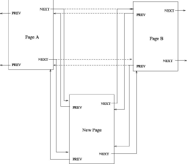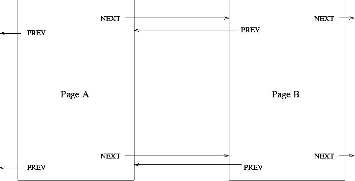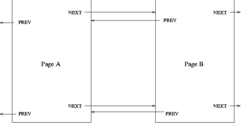 The talk went well, but I saw several places where I could improve the talk. When I started adding pages to the document, I made a very important discovery: inserting pages was a big pain. If I wanted to insert a new page between existing pages A and B. I had to update the NEXT links in page A, update the PREV links in page B, and update both the NEXT and PREV links in the new page. And because I had links at the top and bottom of the pages, there were twice as many links to update. Figure 2 shows the revised links.