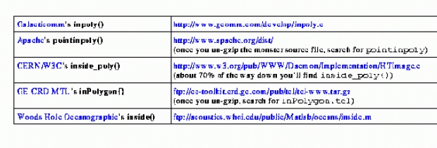 The resulting C-language routine has just three if statements and no divides. Contrast that with three divides and ten if statements in the corresponding routine that's part of the popular Apache web server. Get the Apache distribution and search for pointinpoly to see the whole works. The routine from CERN/W3C's httpd is even worse, weighing in at 19 if statements! Search for inside_poly in their HTImage.c. (The URLs are shown in Table 2.)