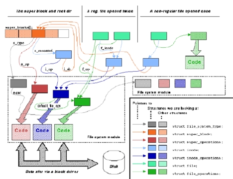 The problem of handling different data formats in a transparent way has been addressed by making super blocks, inodes and files into “objects”; an object declares a set of operations that must be used to deal with it. The kernel won't be stuck into big switch statements to be able to access the different physical layouts of data, and new file system types can be added and removed at run time.